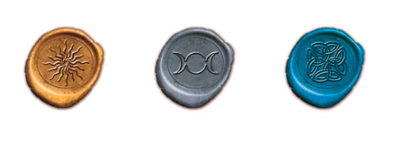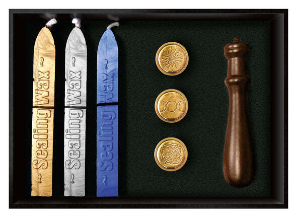 Sæt med tre forskellige farver voks og 3 segl med forskellige spirituelle motiver